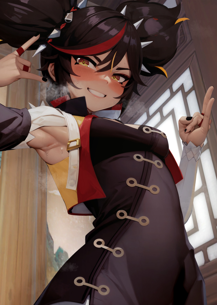 Tags: ai generatedarm uparmpitsblack dressblack hairblack nailsblushbreastsbreathcowboy shotdark skindark-skinned femaledetached sleevesdouble n/femalefrom belowgenshin impactgrinhair between eyeshair ornamentheavy breathingimageboardindoorslooking at viewerlooking downmedium breastsmulticolored hairmultiple ringsnnail polishred hairringRule34short twintailsshoulder spikessmilesolospikesstable diffusionstandingsteaming bodysweatteethtwintailsupper bodywindowxinyan (genshin impact)xinyandegenyellow eyes