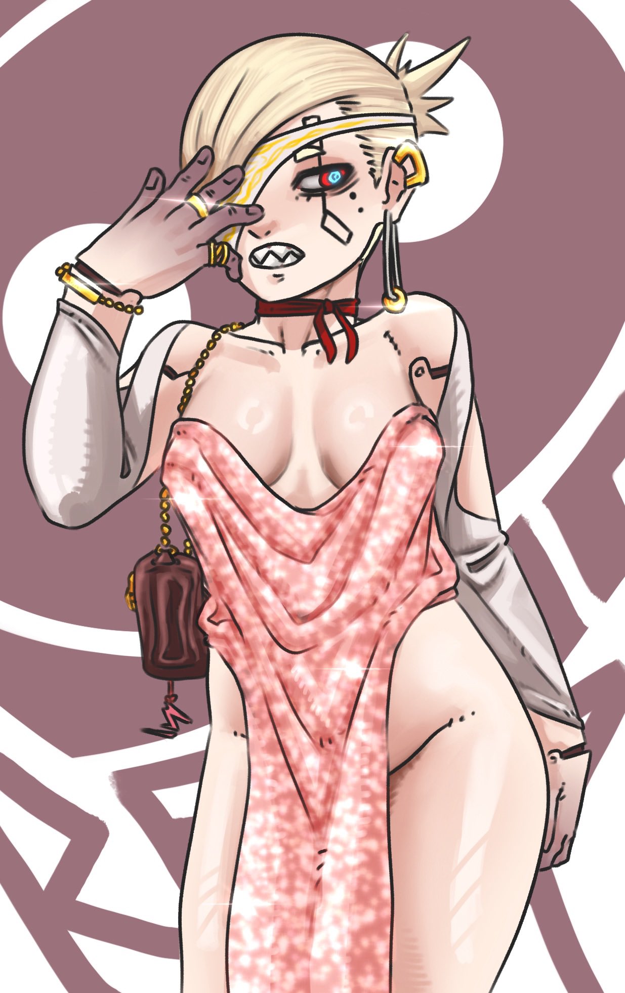Tags: 1girlsbackless outfitblonde hairbraceletchockercleavagecopyright requestdressearringseyepatchfemalefemale onlyimageboardincinerated artjewelryloose clothesoriginal characterpiercingpiercingsponytailpurseringRule34sharp teethsolosolo femalesparklestied hairwristwear