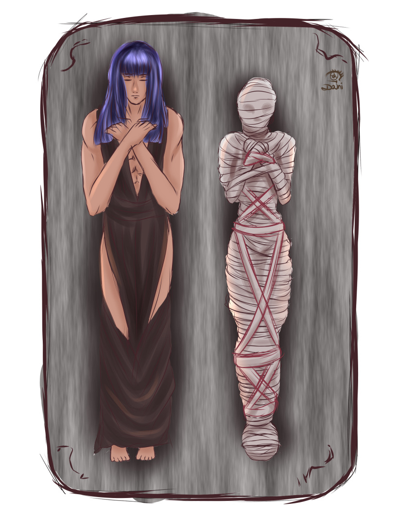 Tags: 1boy1boy1girl1girlsartist signaturebandagebandagesbondagedeviantartegyptianfemaleimageboardlong hairmummificationmummymummy wrappingspurple hairRule34wrapped