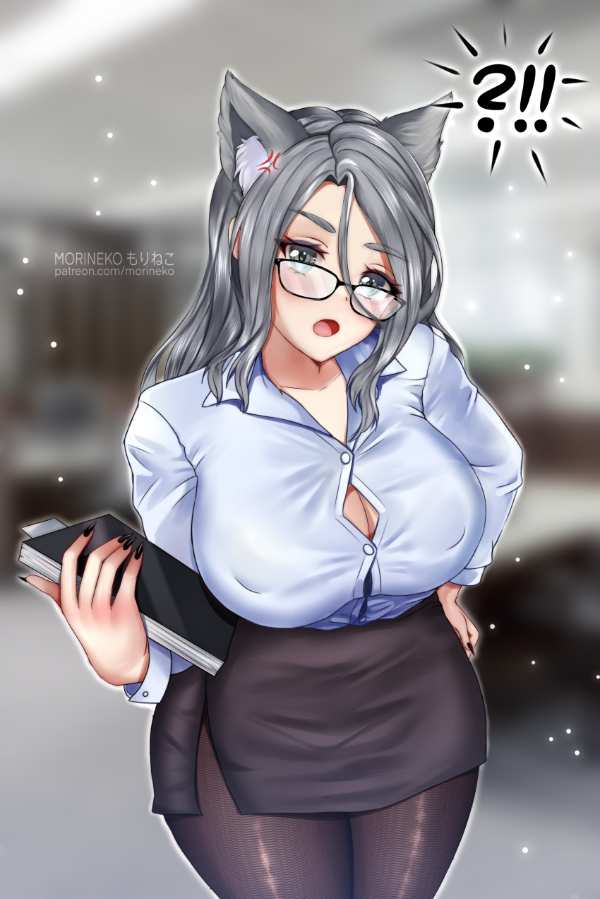 Tags: 1girlsannoyedartist namebig breastsbutton down shirtbutton gapcat earseribyteglassesgray eyesgray hairimageboardmorinekooffice ladyRule34short skirtstockingsvtuber
