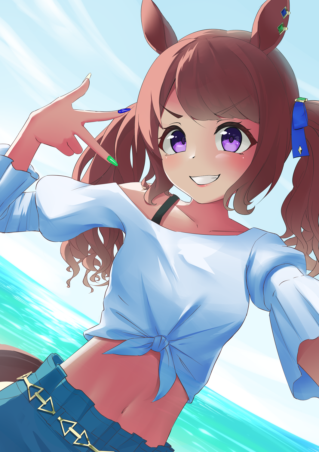 Tags: animal earsao komhuraqua nailsblue skirtblue skyblushbrown haircommentary requestdutch anglefemalegrinhighreshorse earshorse girlhorse tailimageboardlong hairlong sleeveslooking at viewermidriffnaveloceanofficial alternate costumeoutdoorspencil behind earpurple eyesRule34selfieshirtsingle bare shoulderskirtskysmilesolotailtosen jordan (umamusume)twintailsumamusumeupper bodywwaterwhite shirt