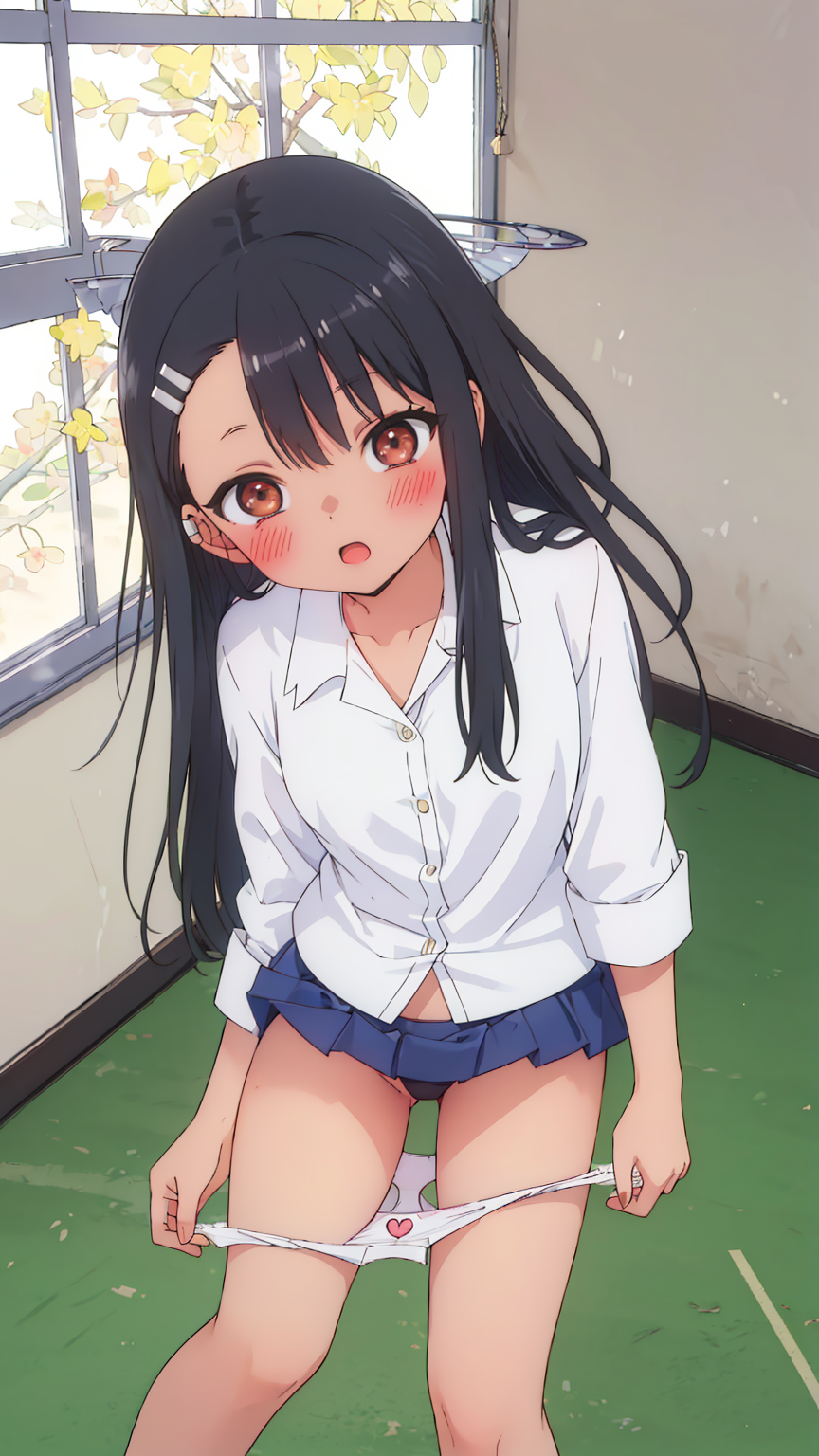 Tags: ai generatedblack hairblue skirtblushbow pantiesbrown eyesfemalehair ornamenthairclipimageboardlong hairlooking at viewernagatoro hayaseopen mouthpantiespanty pullpleated skirtRule34school uniformshirtskirtsolostandingtremblingunderwearwhite shirt