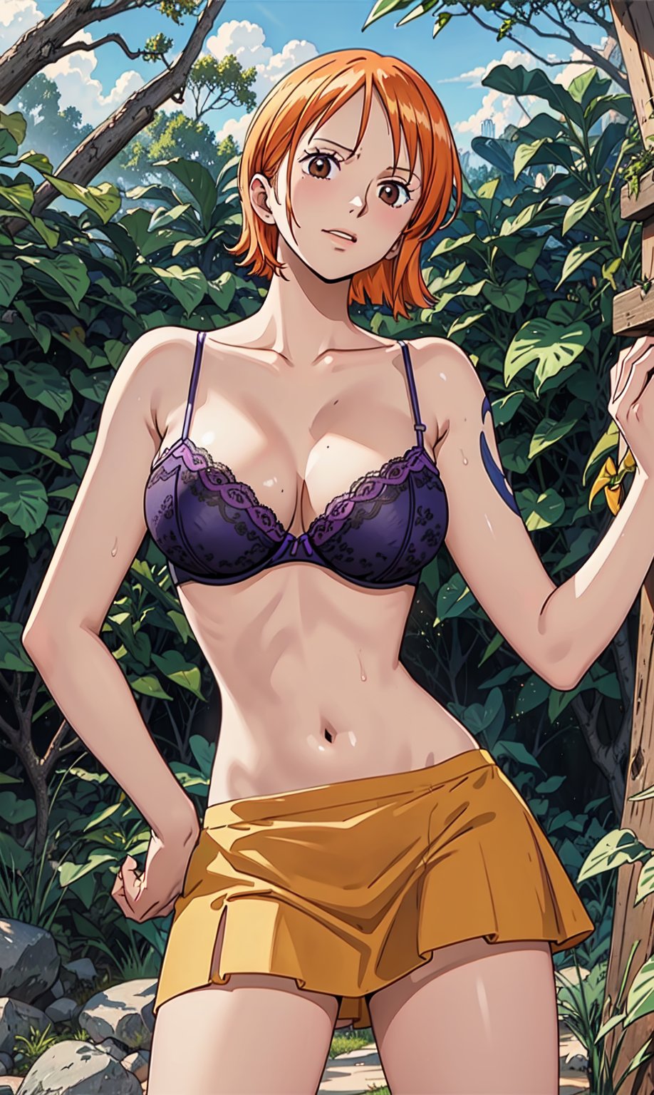 Tags: 1girlsai generatedbelly buttonbig breastsbrabreastscleavagefemalefemale onlyimageboardleaveslittle gardennamino shirtone pieceorange hairoutdoorsoutsideRule34short hairskimpyskimpy clothesskirtsolo