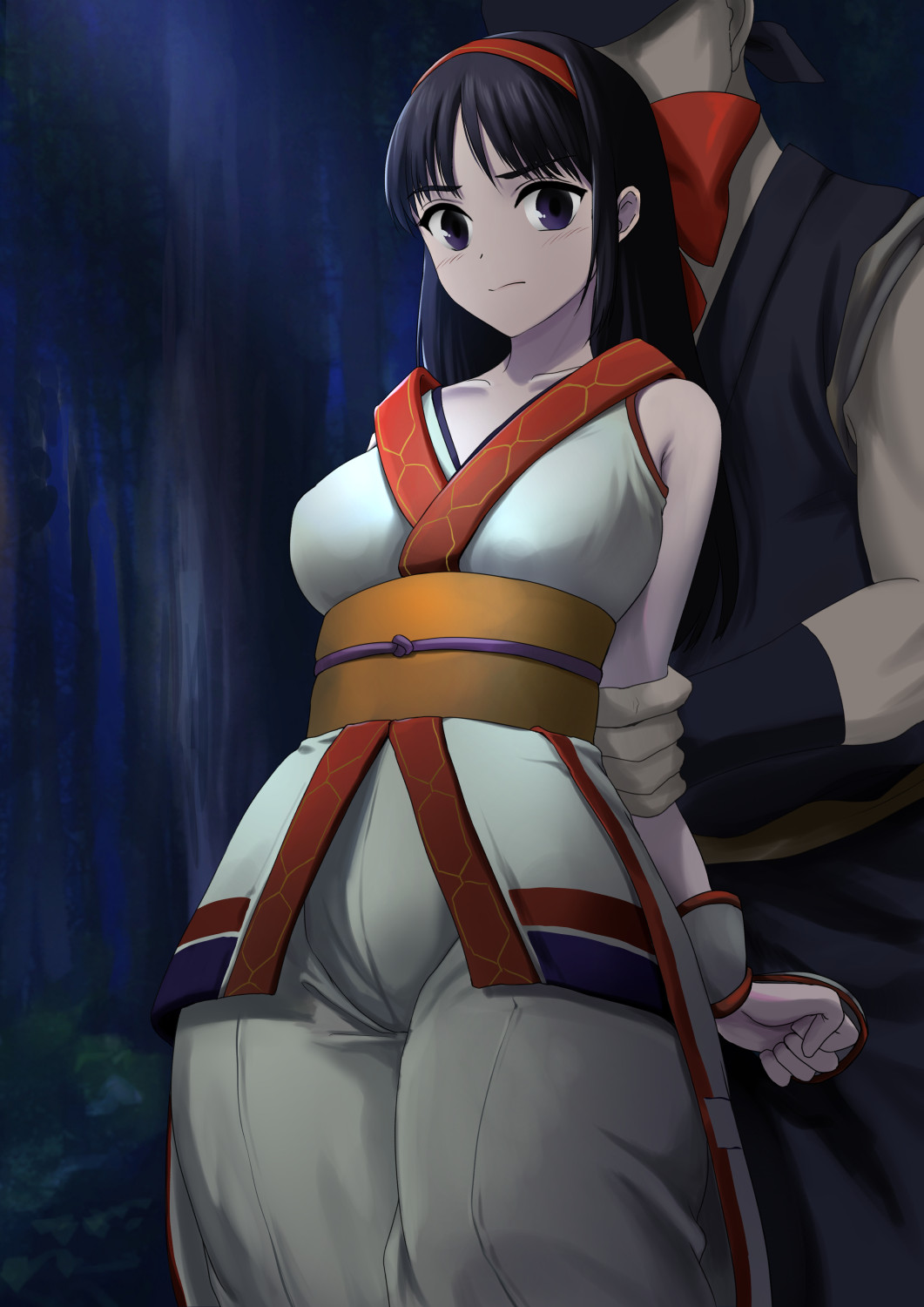 Tags: 1boy1girlsainuainu clothesarm behind backarm grabbig breastsblack hairbreastsbustyhair ribbonimageboardking of fighterslarge breastslegsmalenakorurupantspurple eyesRule34samurai shodownsmilesnkthighs