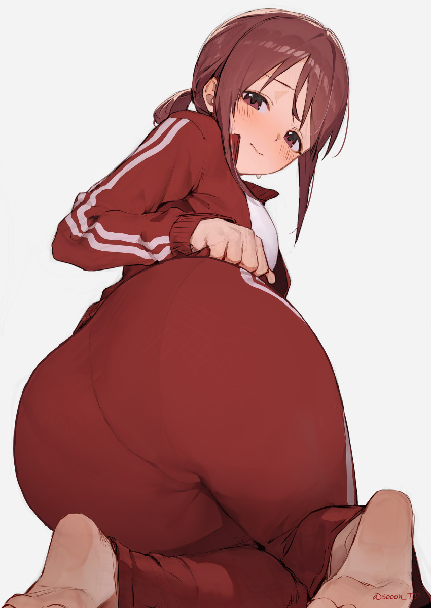 Tags: absurdresassass focusbarefootblushbreastsbrown hairfeetfemaleforeshorteninghighresidolmasteridolmaster cinderella girlsimageboardjacketlooking at viewerlooking backmedium breastsmifune miyupantspantylinesred jacketred pantsRule34simple backgroundsolessolosooonsweattrack jackettrack pantswhite background