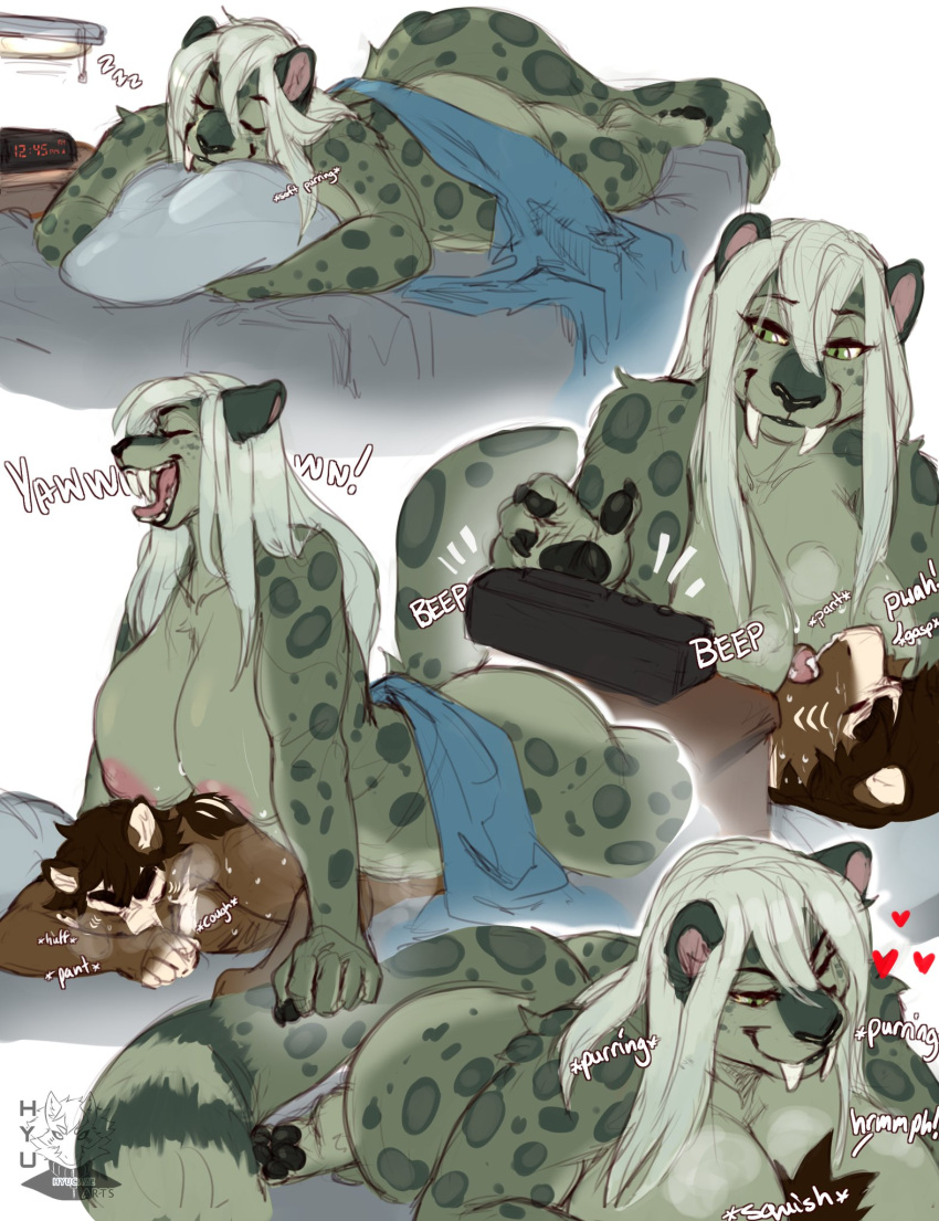 Tags: 1boy1girlsanthrobig breastsbreastscaninecleavageduofelinefemalefurrygreen eyesgreen furhuge breastshyu (hyucaze)hyucazeimageboardlarge breastslarger femalelong hairmalemusknipplesnudeonomatopoeiaRule34saber-toothed catsimple backgroundsleepingsmaller malesound effectswaking upwholesome