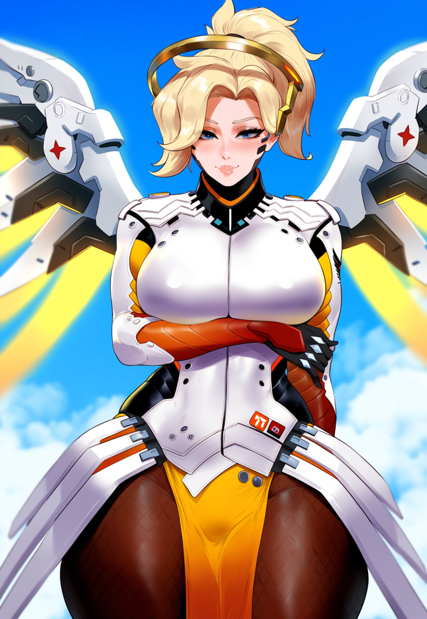 Tags: ai generatedarm under breastsblonde hairblue eyesbodysuitcreamy aicurvylarge breastsmechanical halomechanical wingsmercyoverwatchpantyhoseRule34Search Engine Imageboardthick thighswide hips