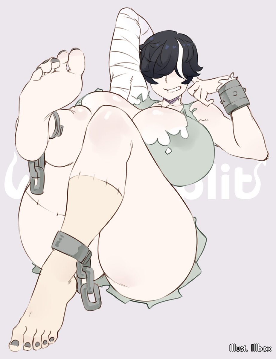 Tags: barefootbarely clothedcleavagecuffed anklesfeetfrankenstein's monsterhair over eyeshuge breastsillboxartimageboardmonster girlRule34shelly (waifusplit)smiling at viewerstichestorn clothingundead femalewaifusplit