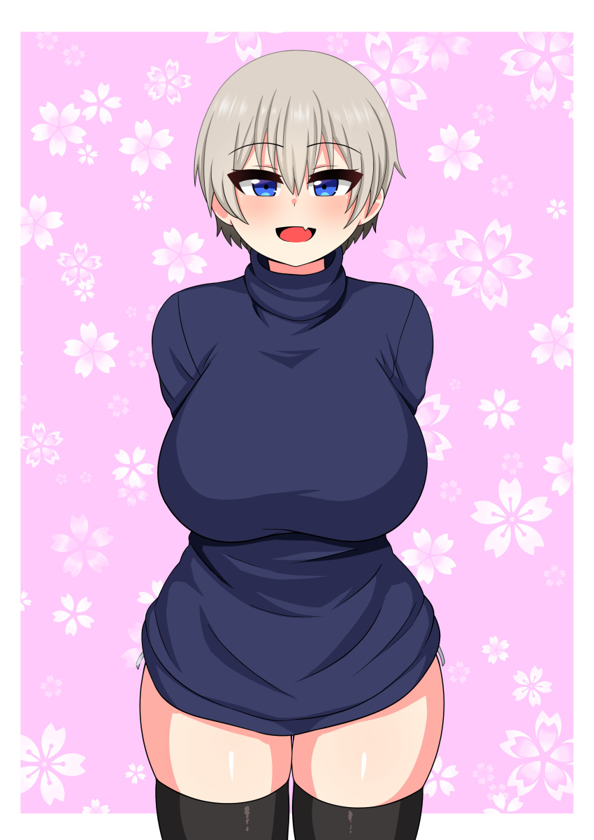 Tags: absurdresalternate costumearms behind backblack thighhighsblue eyesblue sweaterbreastsfemaleflowergrey hairhighresimageboardlarge breastsoerba yun fangpink backgroundRule34solosweaterthe only shoethighhighsturtleneckturtleneck sweateruzaki hanauzaki-chan wa asobitai!