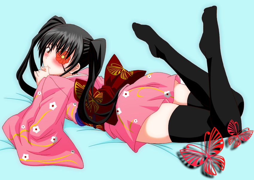 Tags: black hairblack legwearblack thighhighsblue backgroundblushembarrassedeye patchfeet upfemalefemale onlyfull bodygintamaimageboardjapanese clotheskimonolong hairlooking at viewerlooking backobion stomachRule34solotatsuya (guild plus)thighhighstwintailswide sleevesyagyuu kyuubeizettai ryouiki
