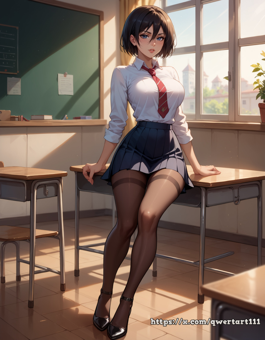 Tags: ai generatedarms behindattack on titanbig breastsblack hairblack heelsblack pantyhoseblack skirtblackboardblue eyesblushbob cutclassroomcurvydaydeskfemalefitfit femalehair between eyesheelshighreshourglass figureindoorslarge breastsleaningleaning backleaning on objectlipslooking at viewermikasa ackermanon deskpantyhosepleated skirtqwertartred tieRule34schoolschool uniformschoolgirlSearch Engine Imageboardslimsmilesolosunlighttagmeteethtiewhite shirtwide hips