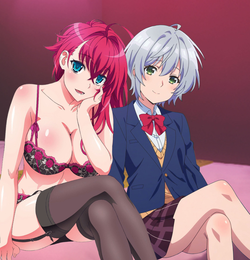 Tags: 2girlscleavageimageboardkikuchi fuukalarge breastslingeriemedium breastsred hairrias gremoryRule34school uniformshort hairside by sidesilver hairsitting