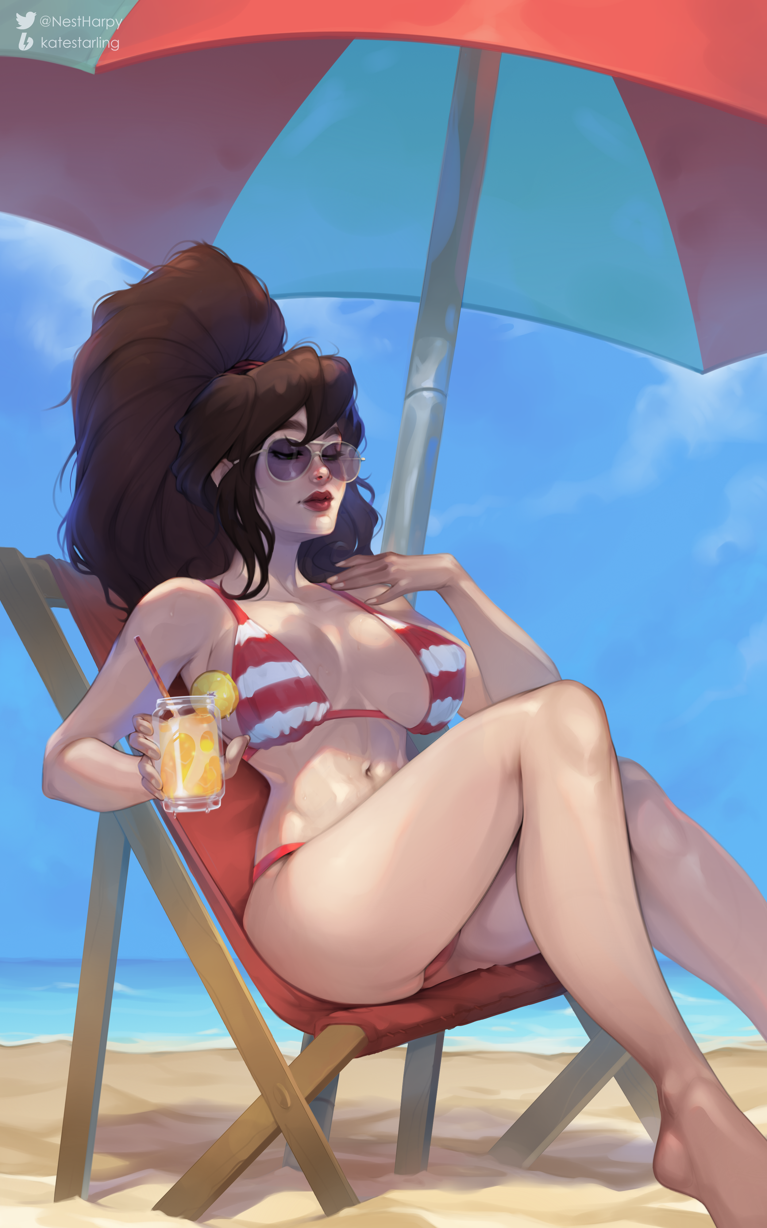 Tags: 1girlsaviator sunglassesbeachbeach chairbeach umbrellabig breastsbikinibrown hairgreen eyeshumankate starlinglemonadelipsticknikki saitooceanpale skinponytailpurple-tinted eyewearrelaxingsunglassestinted eyewear