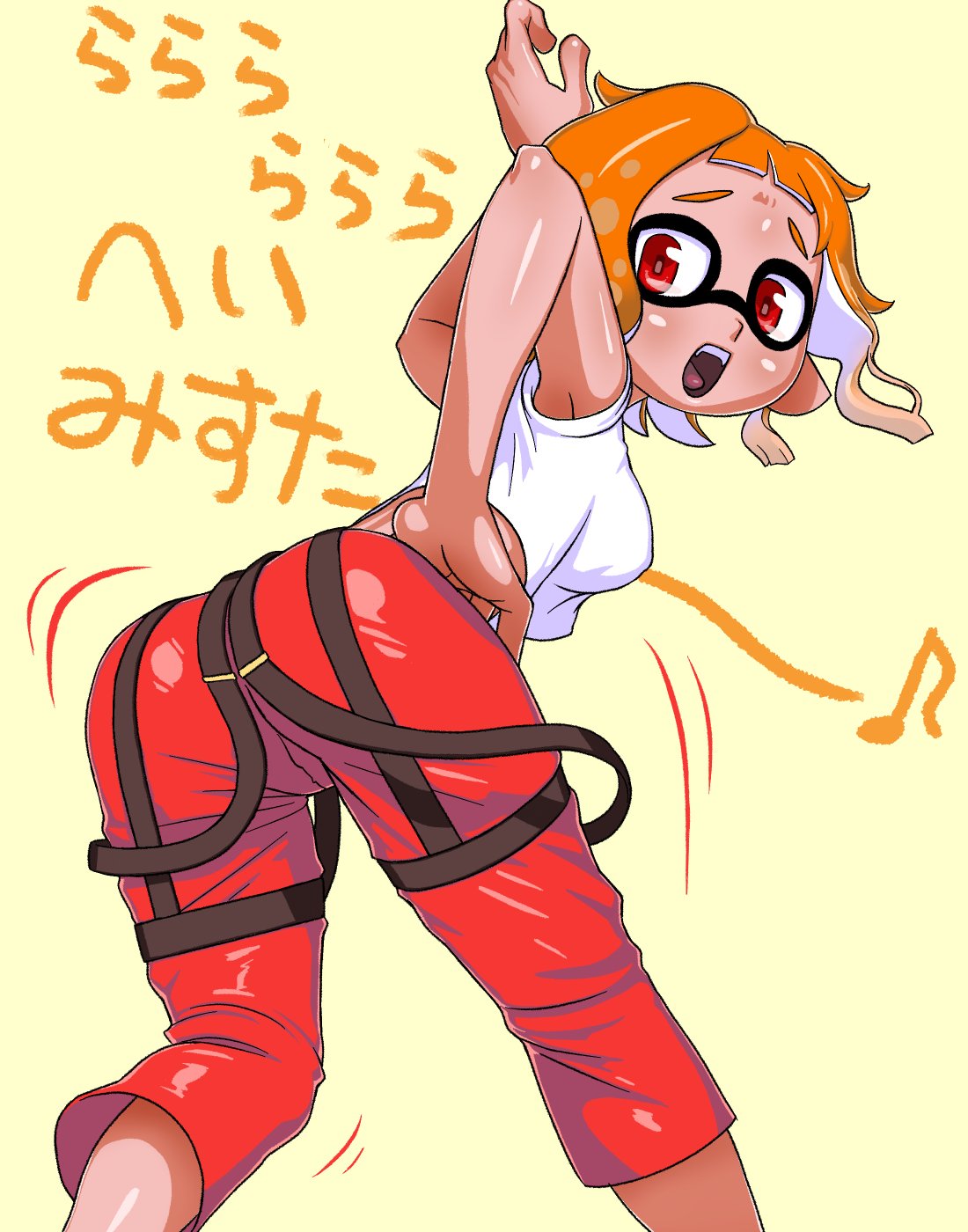 Tags: 1girlsassass shakecolored backgrounddigital drawing (artwork)digital media (artwork)femalefemale focusfemale onlyhand on hipimageboardinklinginkling girljapanese textlooking at viewerlooking backnintendoopen mouthorange hairred eyesred pantsRule34splatoonsplatoon 3strapstank toptsuwitchii84work uniform