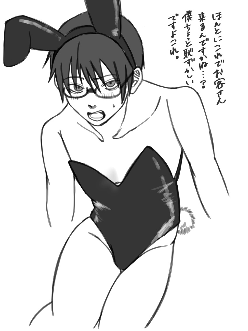 Tags: blushbunny earsbunny tailbunnysuitcrossdressingembarrassedfemboygintamaglassesimageboardjapanese textmalemale onlymonochromeopen mouthRule34shimura shinpachishort hairsketchsolosweatdrop