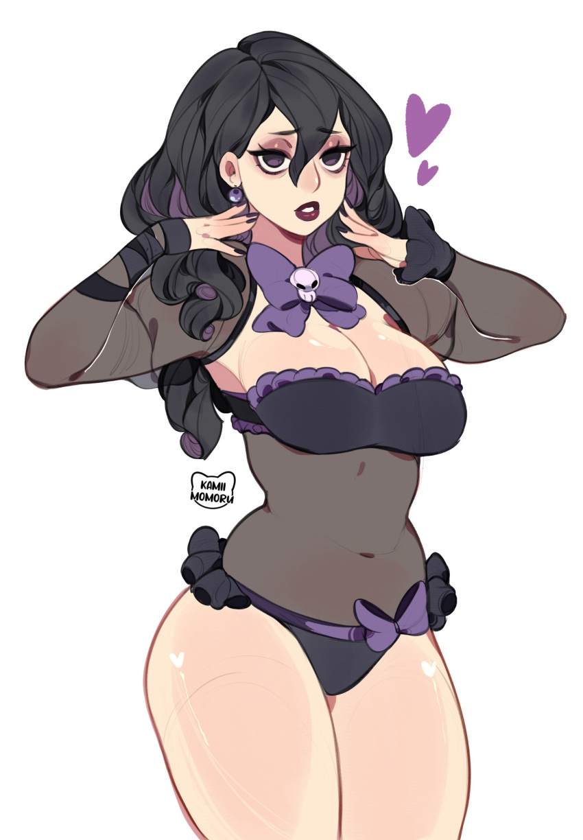 Tags: 1girlsartist namebreastscleavageear piercingearringsfemalefemale onlyhair between eyeshearthex maniachex maniac (z-a)imageboardkamii momorularge breastslight skinlight-skinned femalelingerielipsticklooking at viewernavelnightwearnpc trainerpokemonpokemon legends: z-apurple eyespurple hairrule 34see-through clothingsolothick thighswatermarkwhite background