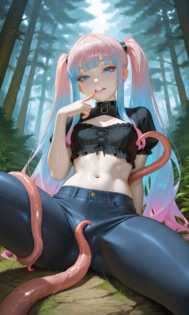 Tags: ai generatedarching backblue eyesblue hairblunt bangscrop topfemalefemale onlyforestfrilled topgradient hairimageboardjeanslong sidelockslooking at viewermedium breastson groundoriginal characterpink hairplopendilrule 34sidelockssittingsmilespread legstentacle on crotchtight pantstwintailstwo tone hair