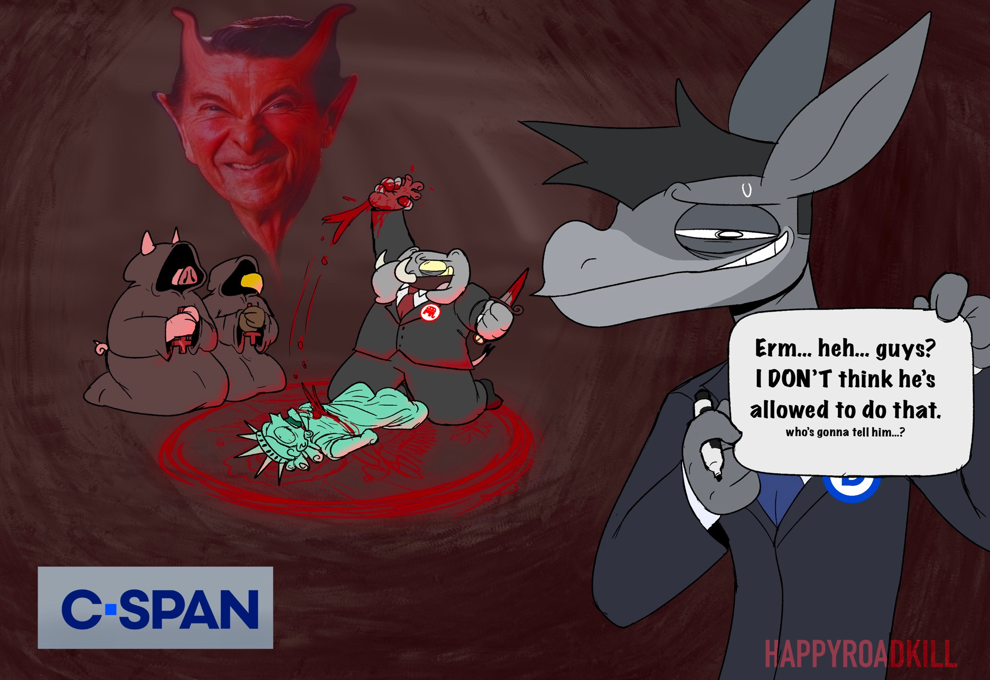Tags: ambiguous genderamerica fuck yeahanthroartist nameasinusavianbirdbodily fluidscrosscultcult of personalitycultistcultist robedaggerdeathdemocratdemocrat donkeydemondemon humanoiddomestic pigdonkeyelephantelephantidequidequineface coveredfemalegleegoregrouphappyhappyroadkillheart (organ)heart anatomyhi resholding daggerholding heartholding heart (organ)holding knifeholding melee weaponholding objectholding organholding signholding weaponhoodhumanhuman sacrificehumanoidkneelingknifelogologo on clothinglyinglying on groundmalemammalmelee weaponmuricanecktienervous grinnervous smilenervous sweaton backon groundopen mouthorgan removalorganspolitical cartoonpoliticsprayer handsprayingpraying handsproboscideanrepublicanrepublican elephantritualritual sacrificeritual siteronald reagansacrificesacrificial maidensignsnuffstatue of libertysuidsuinesus (pig)sweattextweapon
