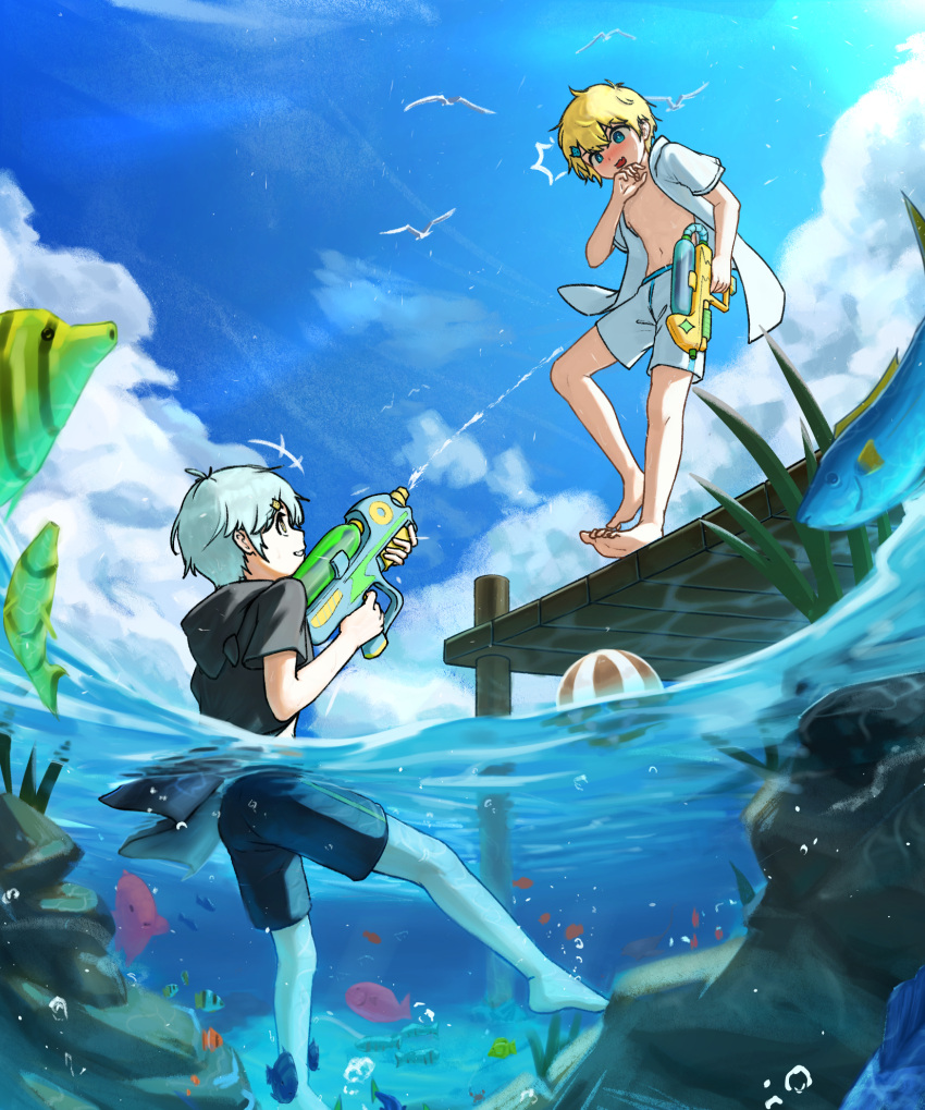 Tags: 2boysalternate version availablebarefootbeachbirdblonde hairblue eyesblushfishimageboardmalemale focusmale onlyoriginaloriginal characteroriginal charactersoutsiderule 34safesafe for workstupidleo2swimmingswimming trunksswimsuitswimwearteal hairwaterwater gunwhite skinwhite skinned maleyellow eyes