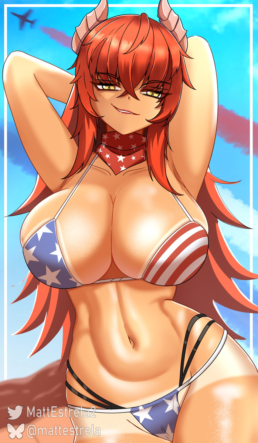 Tags: arms behind headbig breastsbreastscleavagedragon girldragon hornsflag bikiniflag printhornsimageboardlooking at viewerred hairrule 34virtual youtubervshojoyellow eyeszentreya