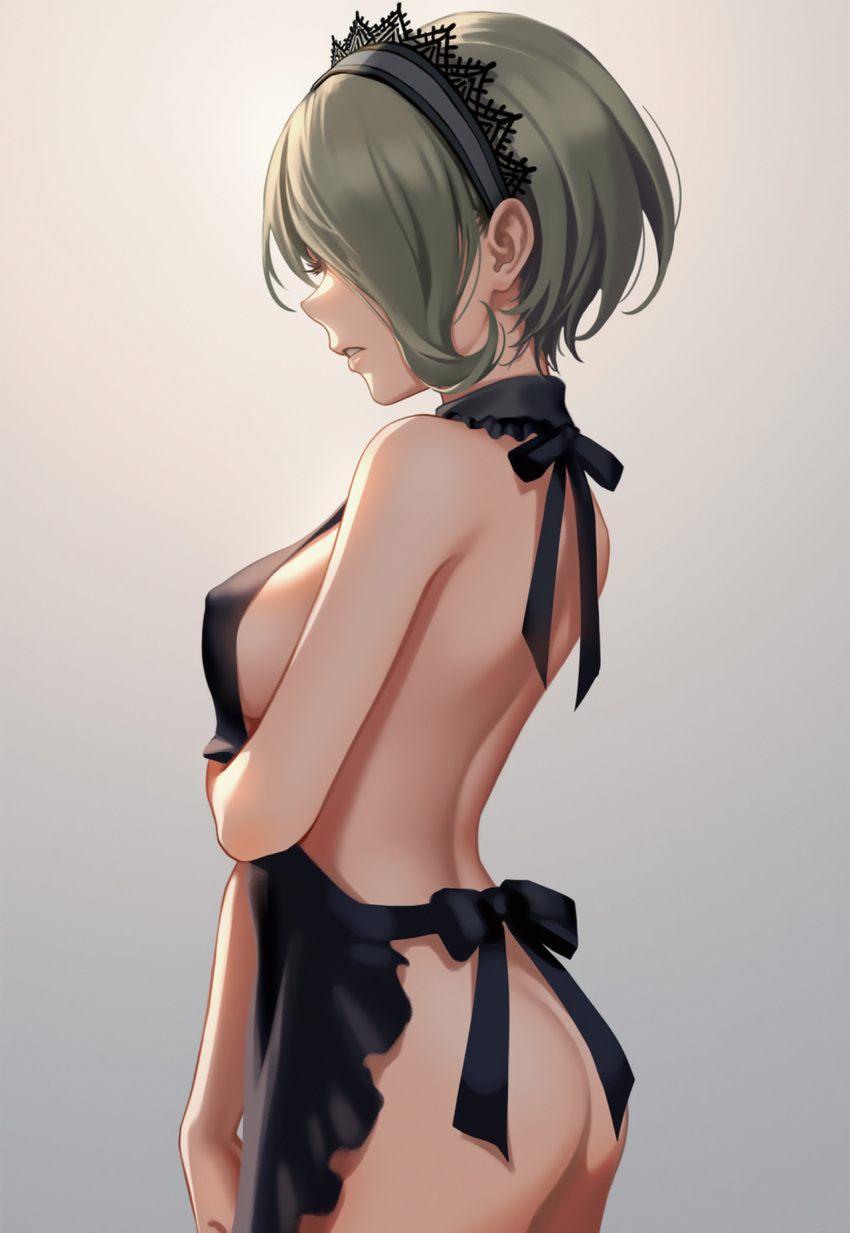 Tags: 1girlsai generatedapronassbangsbare armsblack apronbreastscovered nipplescowboy shotdanganronpadanganronpa v3femalefemale onlygradientgradient backgroundgreen hairgrey backgroundhair over one eyehighresimageboardmaid headdressmedium breastsmiluanai diffusion v4naked apronnovelaiparted lipsprofilerule 34self uploadshort hairsideboobsimple backgroundsolosolo femaletoujou kirumi