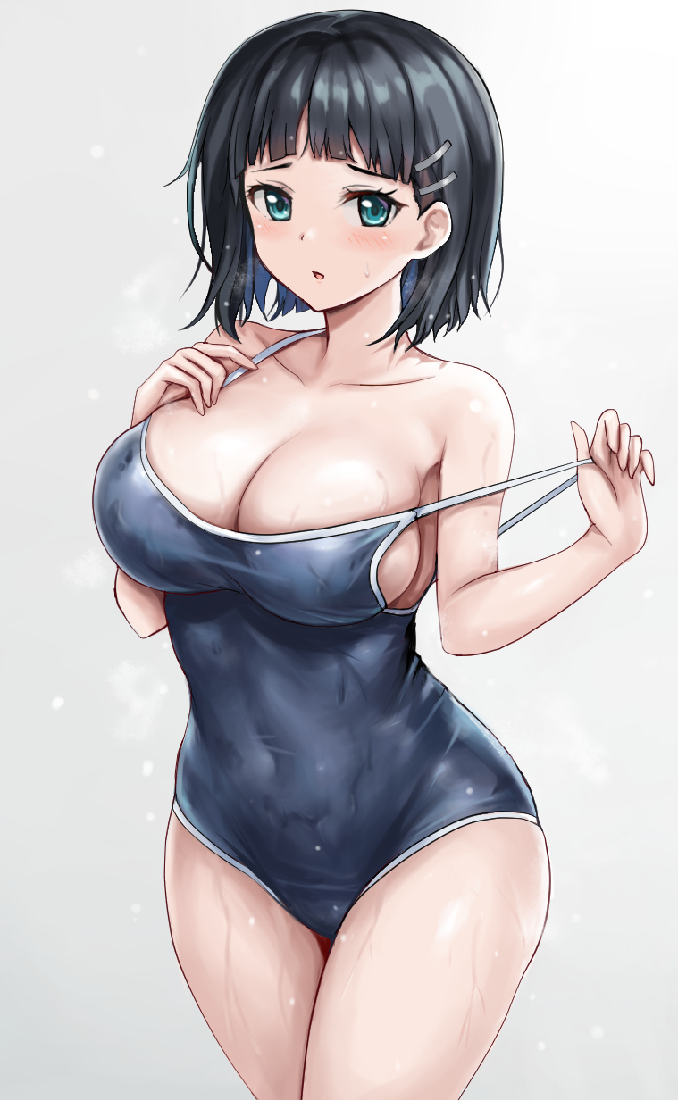 Tags: 1girlsbare shouldersblack hairblue one-piece swimsuitblunt bangsblushbob cutbreastscleavagecollarbonecompetition swimsuitcovered navelcowboy shotfemale onlygreen eyeshair ornamenthairclipimageboardkirigaya suguhalarge breastslooking at viewerone-piece swimsuitparted lipsr-binonraised eyebrowsrule 34short hairsidelockssimple backgroundsolostandingstrap pullswimsuitsword art onlinewetwhite background