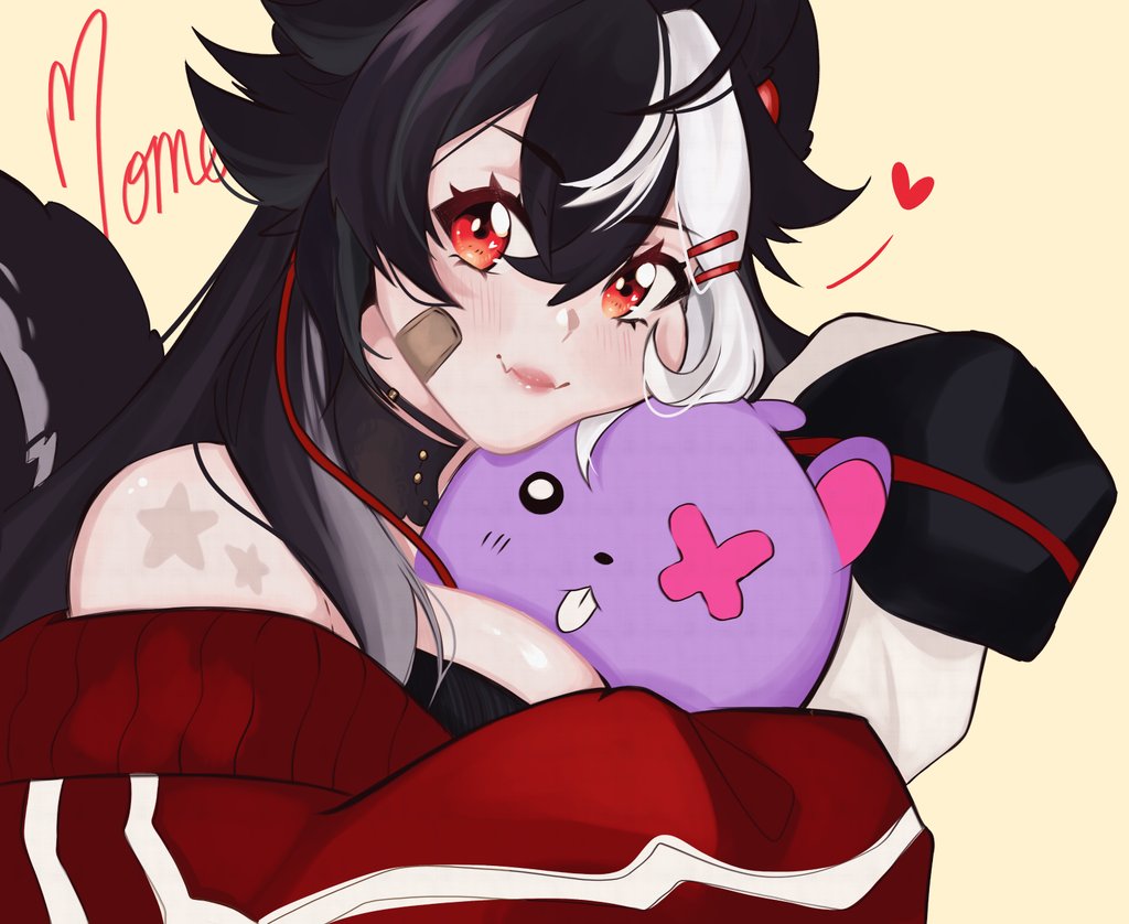 Tags: animal earsbandaidbandaid on facebandaid on nosebangsbare shouldersblack hairblack headwearblushclosed mouthfemalehair between eyeshair ornamenthaircliphatheartimageboardjacketlong hairlooking at viewermomotexx (vtuber)multicolored hairoff shoulderred eyesred hairrule 34simple backgroundsleeves past fingerssleeves past wristssolostar (symbol)streaked hairstripedstuffed toysweaterupper bodyvyugenyellow background
