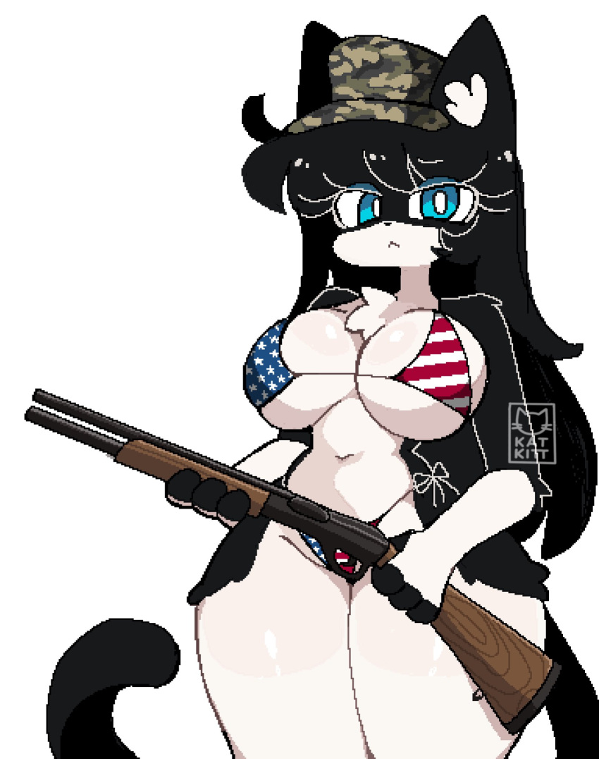 Tags: 1girlsbikiniblack furblack hairbreastscat earscat tailcatgirlfelinefemalefemale focusfemale onlyfirearmflag bikiniflag printfrownfurfurryfurry femalefurry onlygunimageboardkat kittlarge breastslong hairlooking at viewernavelpatriotic clothingrule 34serioussolosolo femalesolo focusthick thighsthighsvery long hairwhite fur