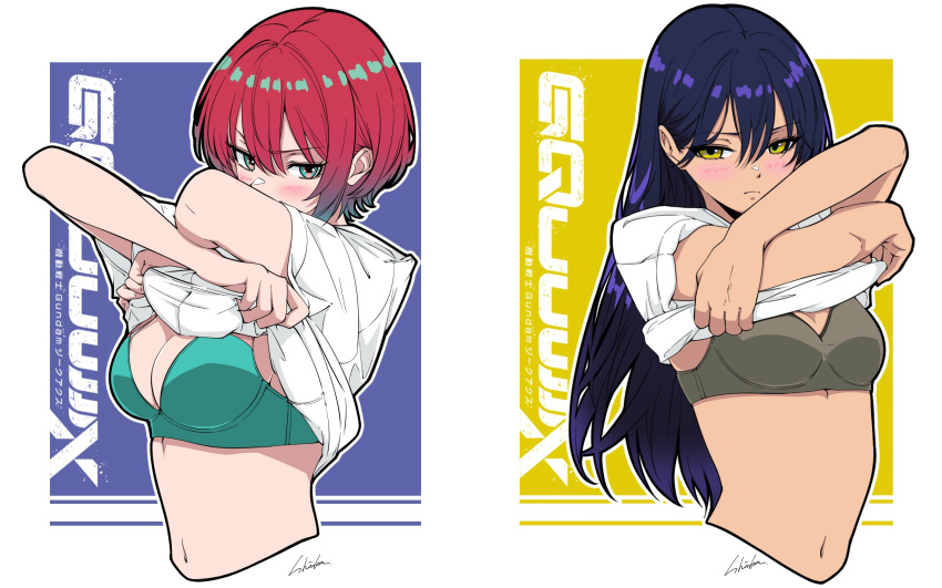 Tags: 2girlsamate yuzurihaartist signatureblue backgroundblushbrabreast size differencecleavagecolorembarrassedenglish texteyebrows visible through haireyes visible through hairgreen bragreen eyesgreen highlightsgrey bragundamgundam gquuuuuuxhalf-closed eyesimageboardinner sideboobjapanese textlightinglooking awaynyaan (gundam gquuuuuux)partially clothedpurple hairred hairrule 34shika snkrsshirt liftsideboobsmall breastsundressingwatermarkwhite borderwhite shirtyellow backgroundyellow eyes