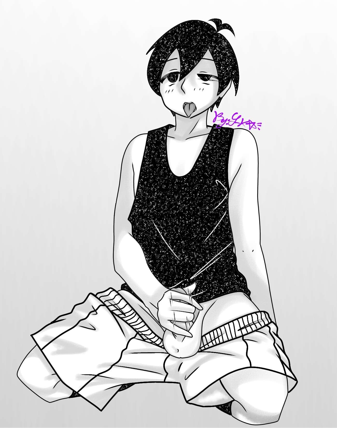 Tags: 1boyanime styleblack and whiteblack eyesblack hairblack tank topimageboardjerking offlooking upmasturbationmotion linesomoriomori (character)omori (game)omori (omori)on kneespenisrule 34shortsshorts downsketchsockssolo focussolo maletongue outwhite backgroundwhite skinyukarin (artist)
