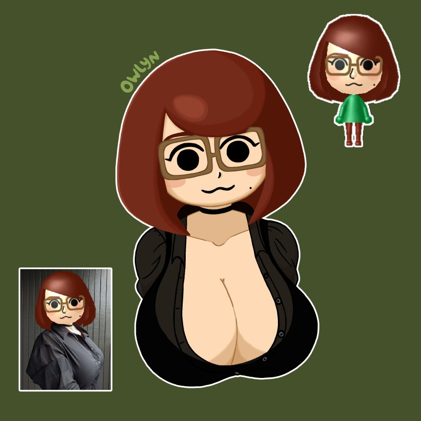 Tags: artist self-insertblack shirtbutton down shirtcleavageglasseshuge breastsimageboardmesh shirtmiimolenintendoowlynowlyn (owlyn)photo comparisonred hairrule 34selfie