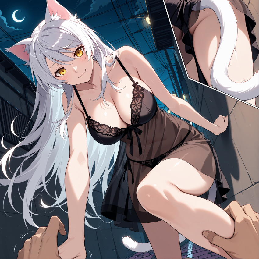 Tags: bakemonogatariblack hanekawablack lingeriecat earscherry blossom scentcrescent moondamp pavementdetailed backgroundfemaleimageboardlong hairmale povmonogatari (series)narrow alleynightperched on wallplayful expressionpov male viewpurringrule 34silver hairstreetlightstailtsubasa hanekawayellow eyes