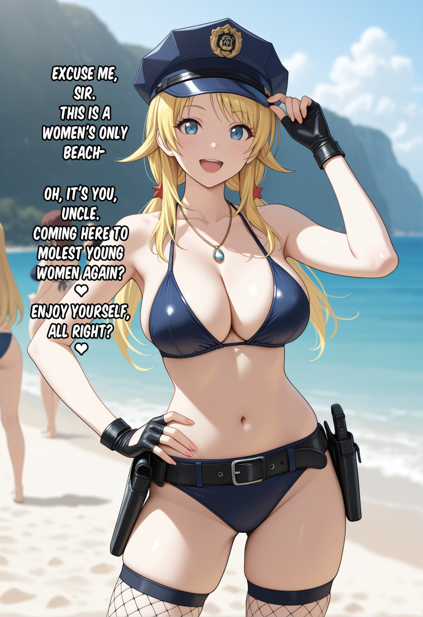 Tags: ai generatedbeachbeltbikiniblack glovesblonde hairblue bikiniblue eyescaptioncleavagecollarbonedayenglish textfingerless gloveshachimiya meguruhand on hipimageboardlarge breastslong hairlooking at viewerlow twintailsmultiple girlsnavelnecklaceopen mouthoutdoorspolicepolice hatrule 34smilesolo focusswimsuitthighhighstwintails