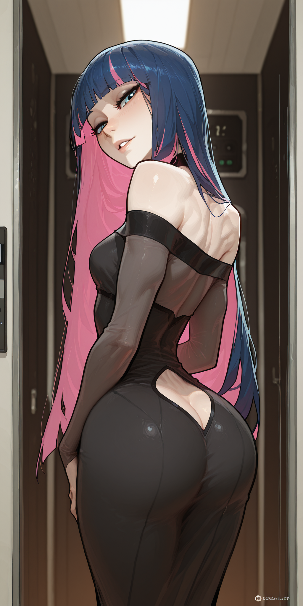 Tags: 1girlsai generatedalluringassass cleavageblue eyesblue hairchokercolored inner hairdresselevatorhead tilthornyimageboardlong hairlooking backmulticolored hairoff-shoulder dresspanty & stocking with garterbeltperfect assperfect bodypink hairrule 34sexysmall breastssolostandingstocking anarchysuggestiveteasing viewertight clothingtwo tone hairview from back
