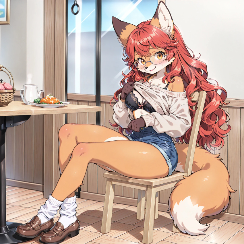 Tags: ai generatedamber eyesblack brablack bra strapsblushbrown shoescream shirtfemalefox earsfox girlfox humanoidfox tailglassesgunsmith576imageboardjean shortslong hairorange furpetite bodyred hairrule 34sabrina (fox girl)shirt liftsmall breastssolothick thighswavy hairwhite sockswild hair