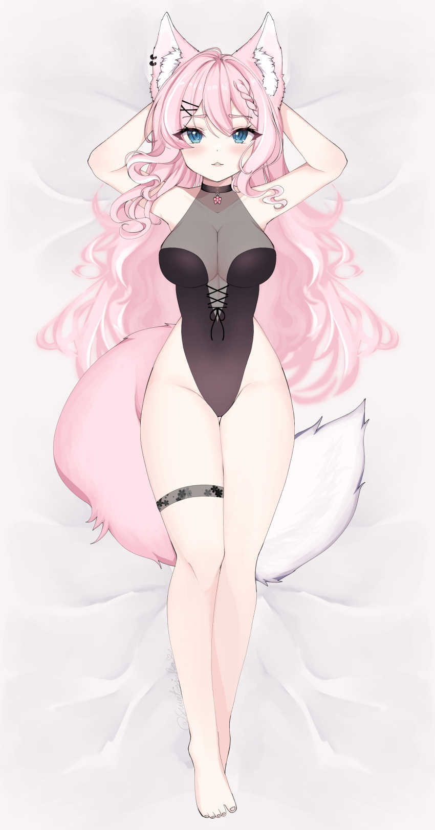 Tags: animal ear fluffbare legsbarefootbig breastsblack clothingblue eyesblushfeetfemalefemale onlyfluffy tailfox earsfox girlfox tailhair ornamenthand behind headimageboardlong hairlying on bednude femalepink hairpink nipplesRule34sissikawaiithick thighsvirtual youtubervtuber