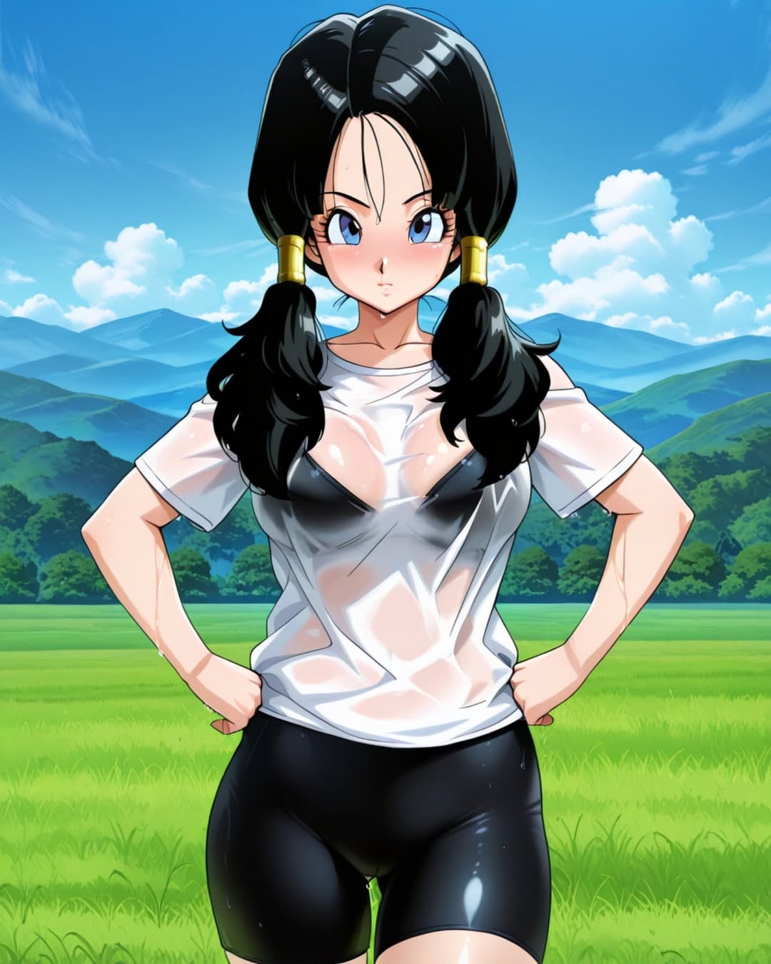 Tags: 2025ai generatedanimebikini under clothesblack bikiniblack eyebrowsblack hair femaleblack long hairblue eyes femaleclosed mouthcrunchyrolldragon ballgolden hairwearhands on hipsimageboardinstagrammangametamouth closedpark backgroundred cheeksrule 34toei animationunknown artistvidel (long hair)wet bodywet clotheswet shirtwet shortswet skin