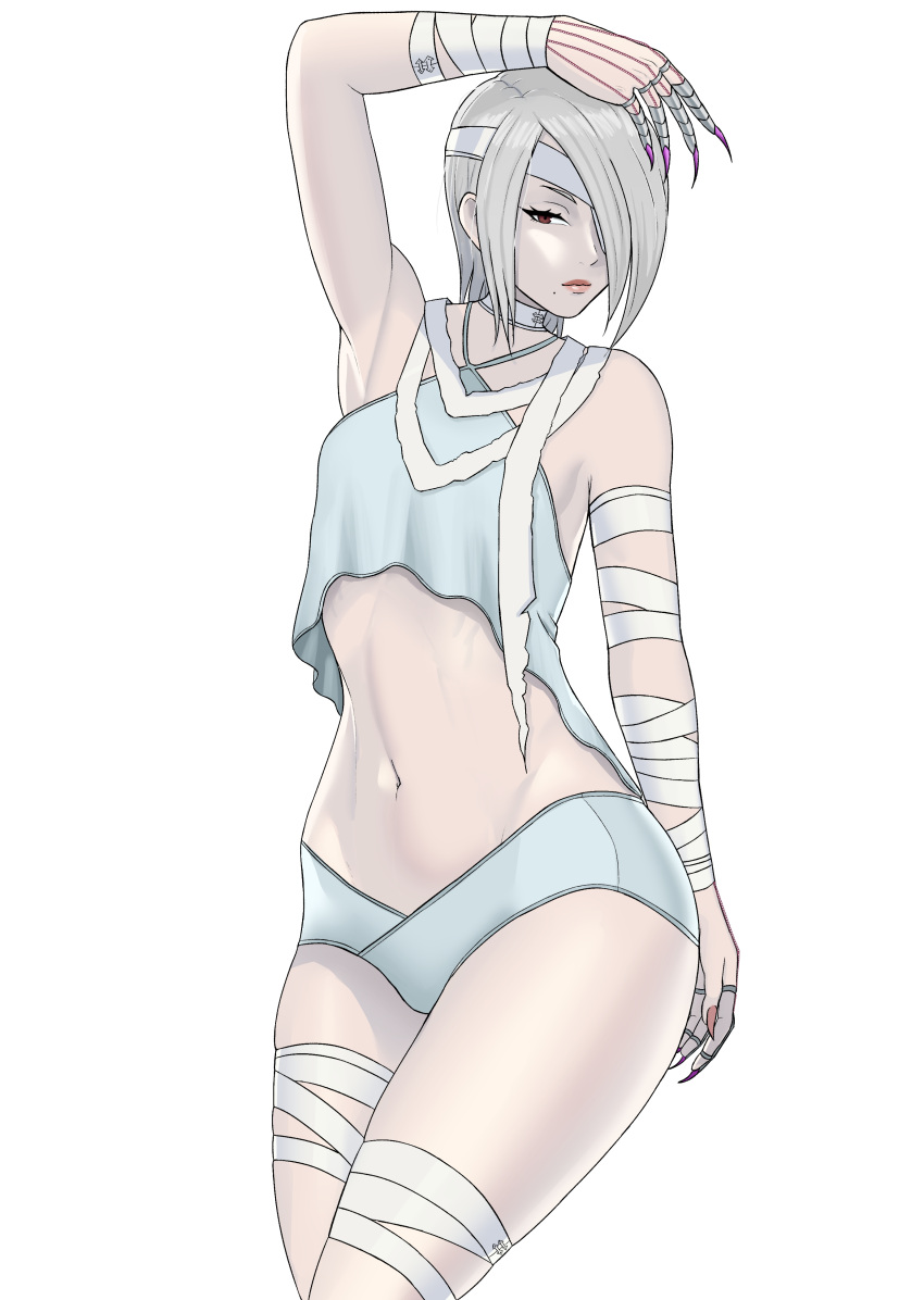 Tags: 1girlsa.k.i.arms upbandagecleavagefemalegrey hairimageboardlooking at viewerpindoragonred eyesrule 34street fighterstreet fighter 6swimsuittummywhite background