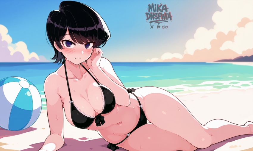 Tags: ai generatedarm supportbare armsbeachblack hairblue skyblushbreastsclosed mouthcloudcollarbonedayfemalehand upimageboardkomi shuukokomi-san wa komyushou desulooking at viewermedium breastsmikadnsfwianaveloceanoutdoorspurple eyesrule 34sittingskysmilesolostomachthighswater