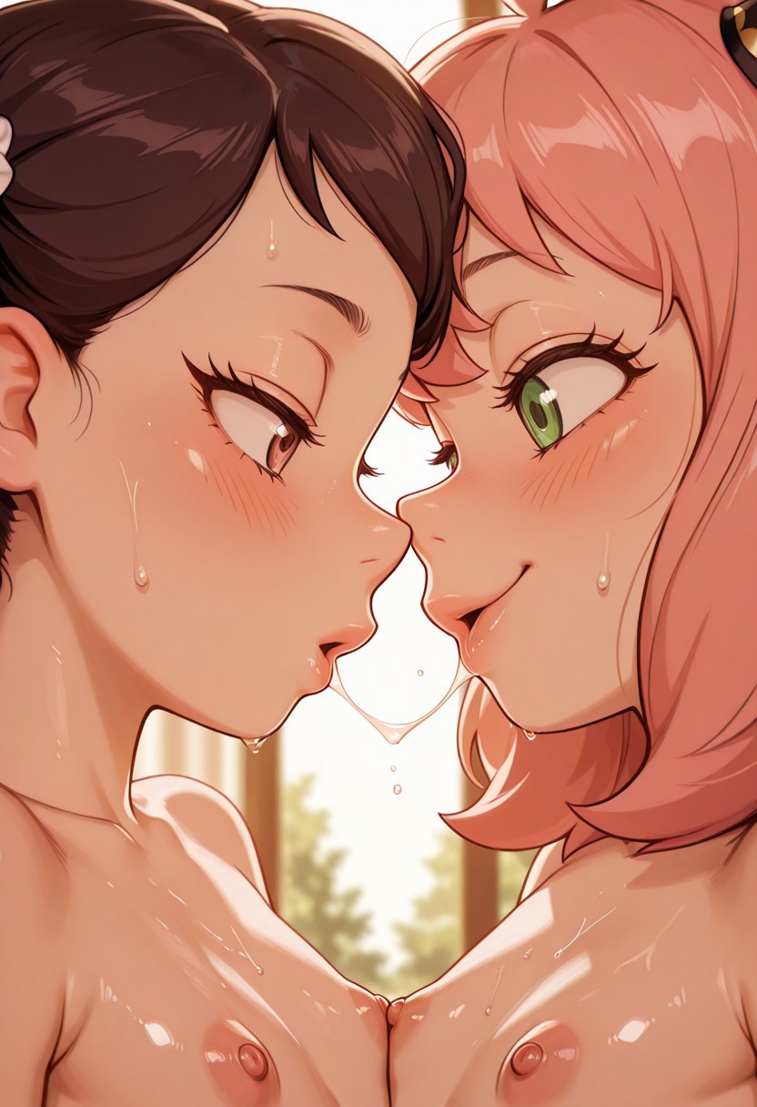Tags: ai generatedanya forgerbecky blackbellblushbreasts against breastsbrown eyesbrown hairdrollinggirl kisses girlgreen eyesimageboardkissingnipplespink hairrule 34salivasaliva stringsaliva trailspy x familyyuri