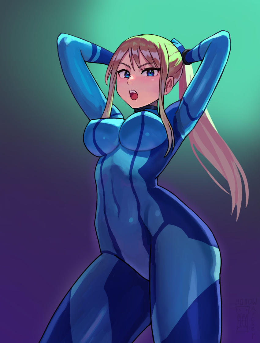 Tags: 1girlsabsurdresarms upblonde hairblue bodysuitblue eyesbodysuitbreastscovered navelfemalehighreshollow watcherimageboardlarge breastslong hairlooking at viewermetroidnintendoopen mouthponytailrule 34samus aransoloteethupper teeth onlywatcher hollowzero suit
