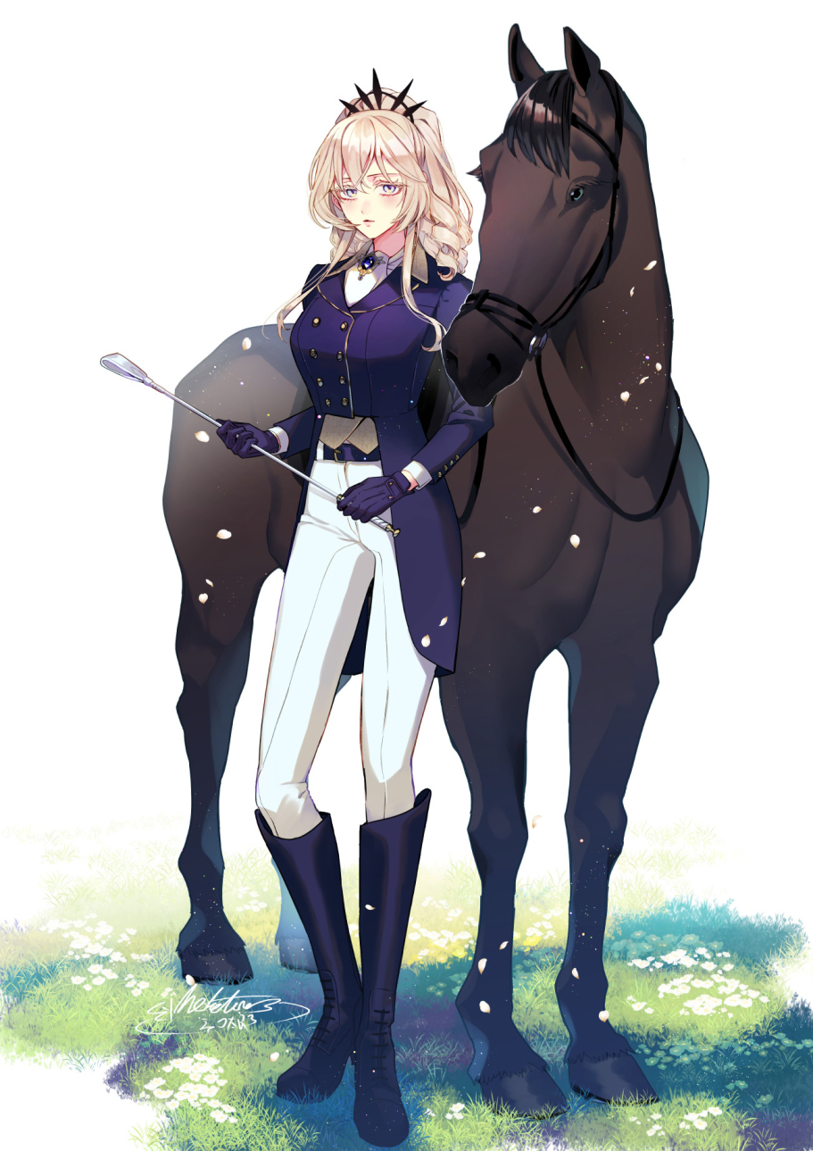 Tags: 1girlalternate costumeblonde hairbootsbroochfemalegenkai ol-san wa akuyaku reijou-sama ni tsukaetaigloveshair ornamentholdingholding riding crophorsejewelryknee bootslapis tenebraeon grasspantsriding bootsriding cropriding outfitshinonome neko-taroutiara