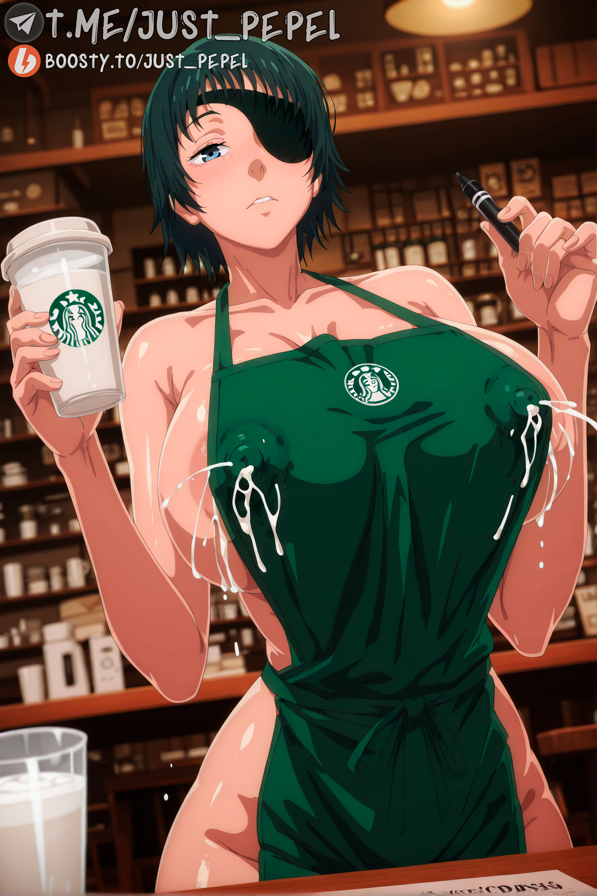 Tags: apronblack hairblue eyesblushbreastscafecleavagecollarbonecovered nipplescupdisposable cupeyepatchfemalegreen apronholdingholding cupholding penhuge breastsindoorslactationlactation through clotheslarge breastslooking at viewermarkernaked apronparted lipspenshort hairsolo