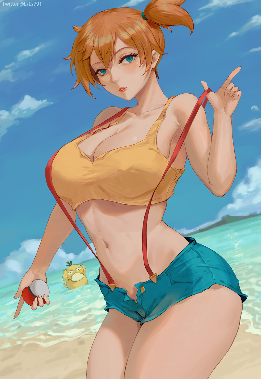 Tags: bare shouldersbeachblue eyesblue shortsblue skyblushbreastscleavagedenimdenim shortsfemalelarge breastslooking at viewermedium hairmidriffnavelorange hairpoke ballpoke ball (basic)shoreshort shortsshortsside ponytailskysuspender shortssuspenderstank topthighsyellow tank top