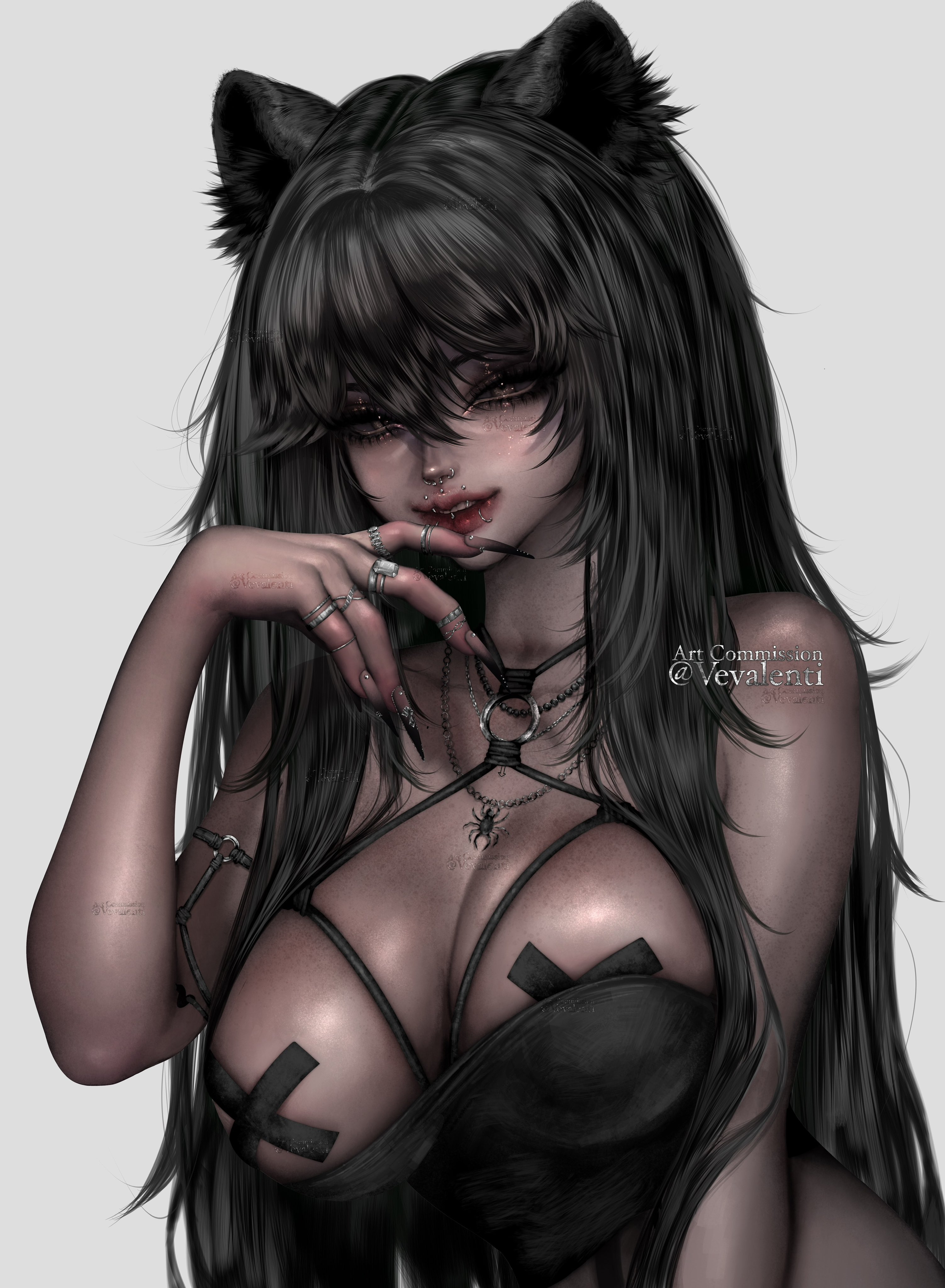 Tags: 1girlsanimal earsapr1i6 (artist)black hairbreastsbrown eyeslip piercinglong nailsnose piercingringssharp nailssolotape on nipples