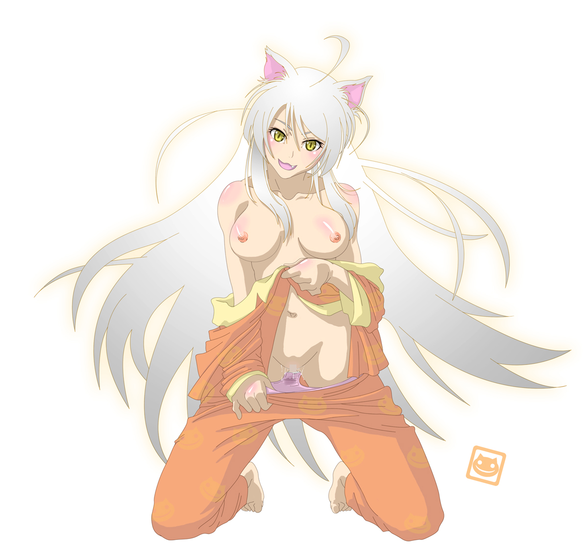 Tags: 1girlsanimal earsbarefootbreastscute fangfemalekneelinglong hairnipplesno braopen mouthpajamaspantiespanty pullpink pantiespussypussy juicesilver hairslit pupilssolotoplessunderwearundressingvery long hairyellow eyes