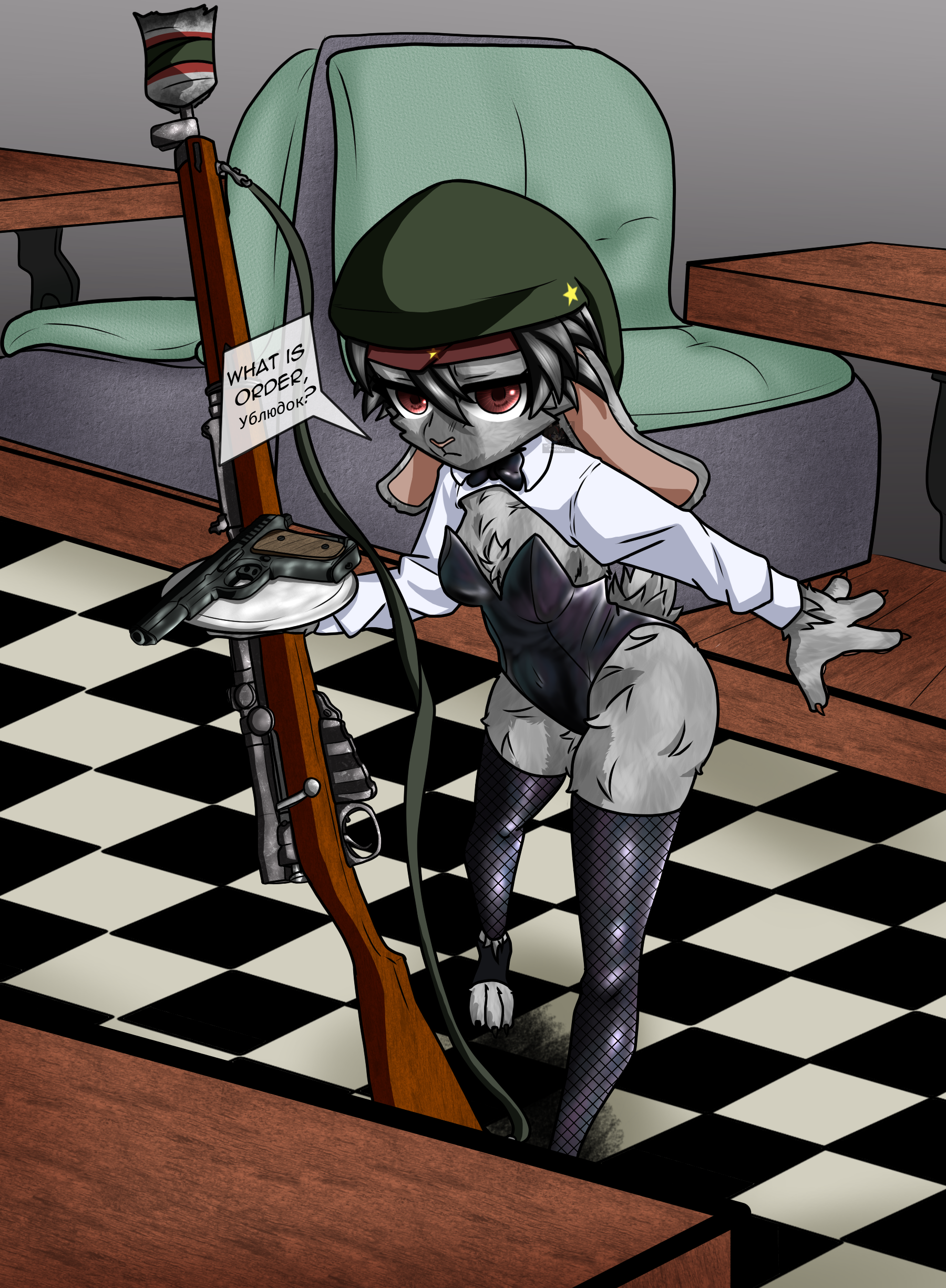 Tags: anthroanthro femaleblack hairbubble assbubble buttbunnybunny costumebunny earsbunny girlbunny tailbunnysuitbustydirty talkfurryfurry femalegrey furhostesslong earsmosin-nagantred eyesriflerifle slingwaitress