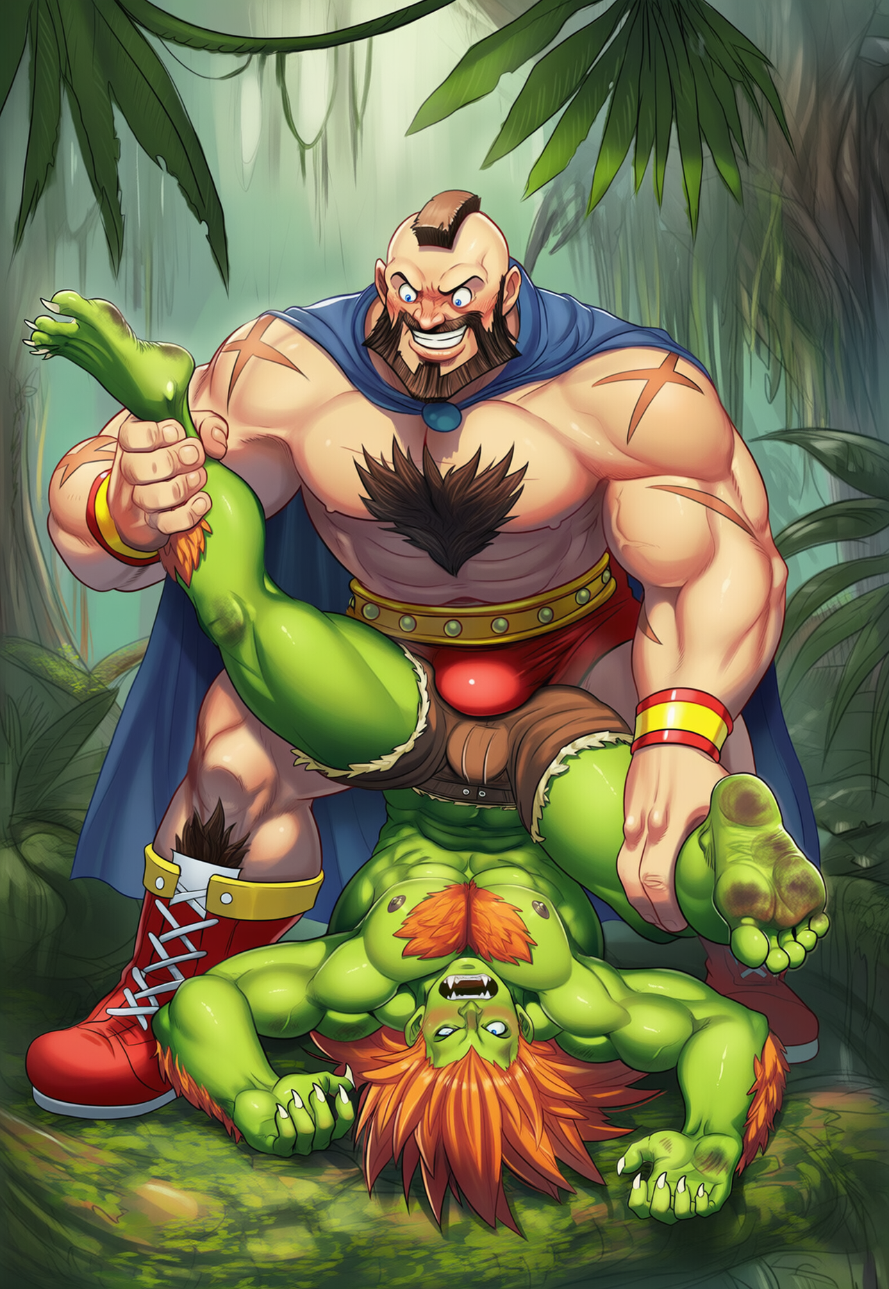 Tags: 2boysaudiencebarabarefootcapeclothedclothed sexdefeateddirtydirty feetfrottagefrottage through clothinggreen bodygreen skinhumanhuman on humanoidhumanoidjean shortsjunglemalemale onlymale/malemohawkmusclesmuscularmuscular maleon backorange hairpinnedplow poseredred bootsshoesspeedosquattingwrestling