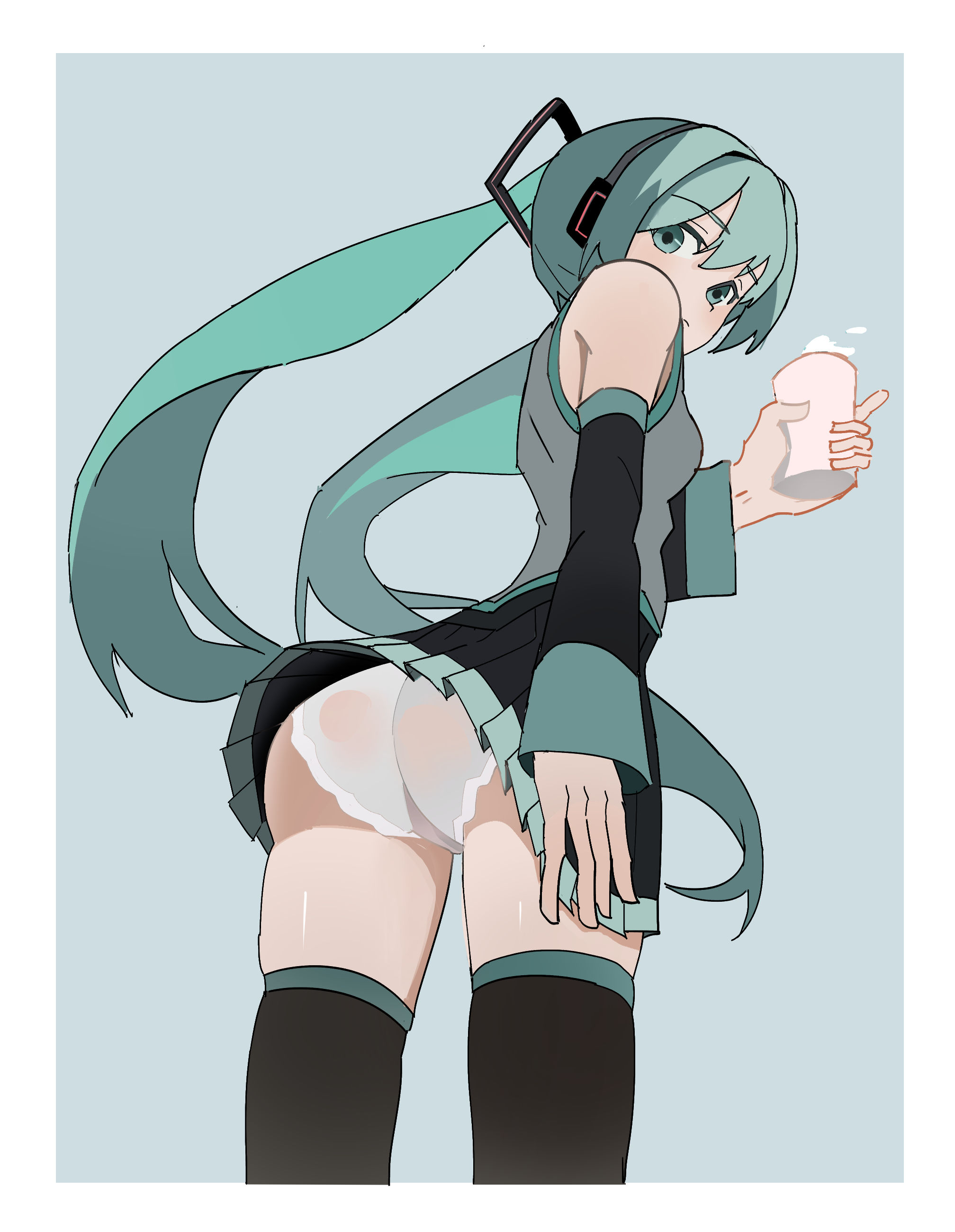 Tags: 1girlsaqua eyesaqua hairassdetached sleevesfemalefrom behindlooking at viewerlooking backpantiesskirtstandingthighhighsthighstwintailsupskirtwhite panties