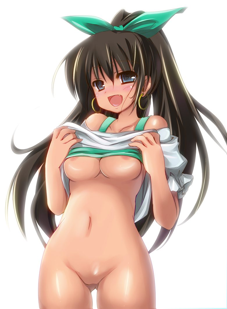 Tags: 1girlsareolaeblack hairblue eyesblushbottomlessbreastscute fangfemalehair ribbonjewelryno pussyponytailribbonshinyshiny skinshirt liftsolotied hairunderboob
